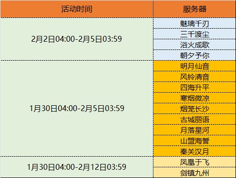 因源服务器与对应目标服务器开服时间差距的天数不同,不同源服务器开启助力活动的时间不同,若源服务器与目标服务器的开服时间相近,该源服务器将不会开启助力活动。以下为开启活动的时间及对应源服务器: