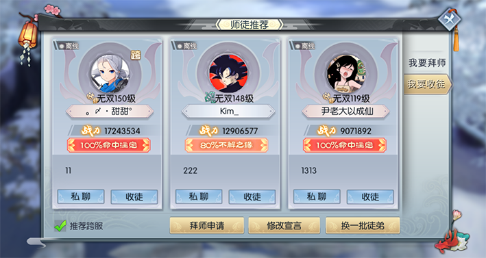 拜师收徒支持跨服啦!打破服务器的界限,壮大你的师门吧!点击查看详情。